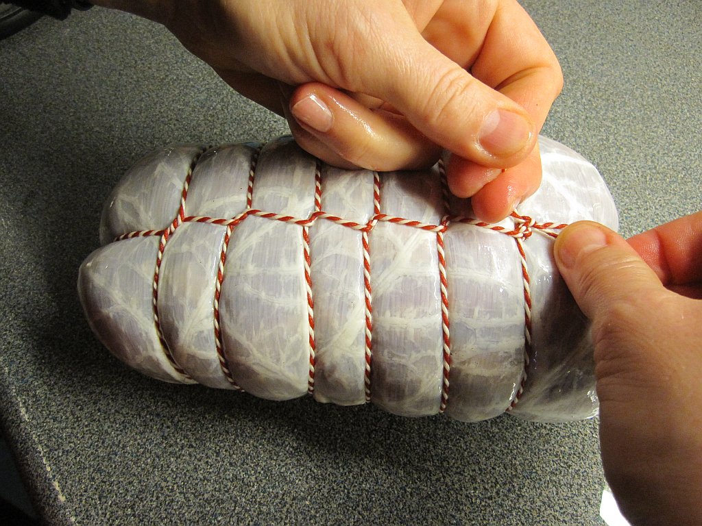 - Het drogen, hierbij hang je het vlees op een koele (niet hoger dan 15°C) licht ventileerde plaats. Afhankelijk van het recept wacht je totdat het product 30-40% gewichtsverlies heeft.
