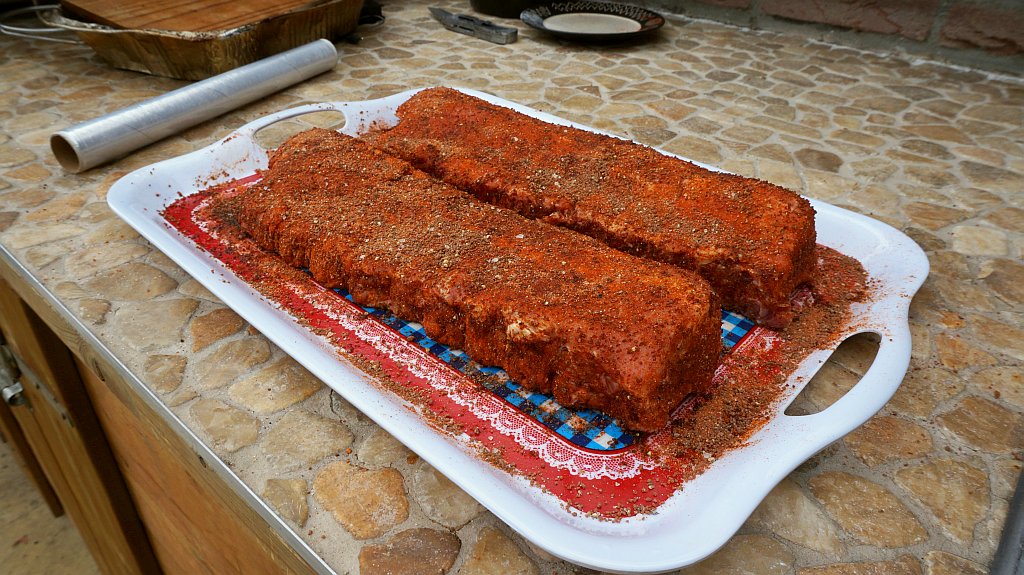 - Bestrooi de ribs met de rub aan alle zijdes.