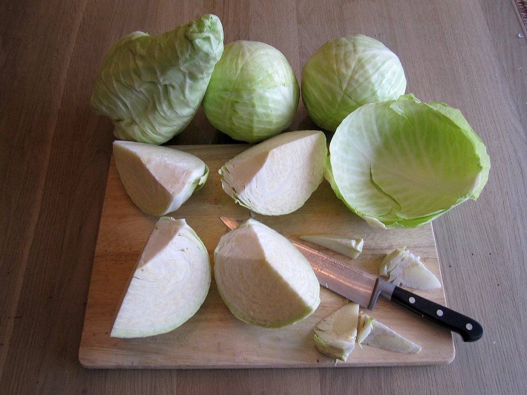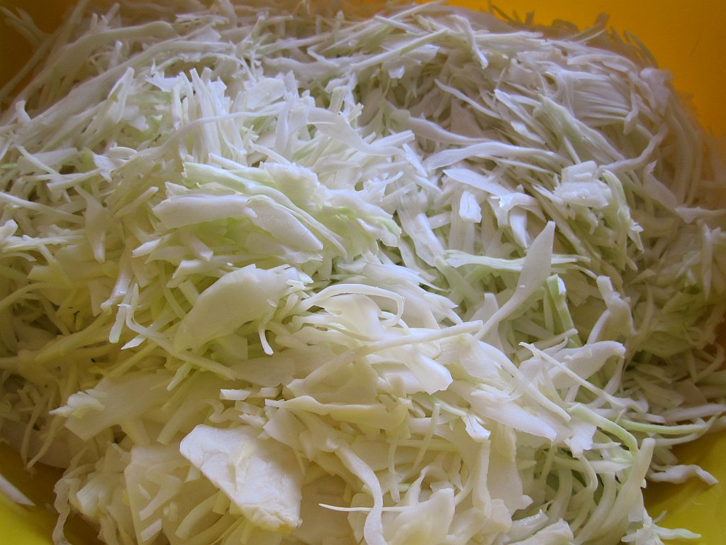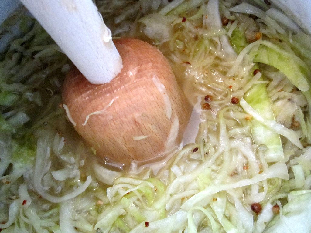- Laag voor laag de geschaafde kool inleggen. De klein gemaakte stronk erdoorheen mengen en heel goed aanstampen. Sap moet kool geheel bedekken.