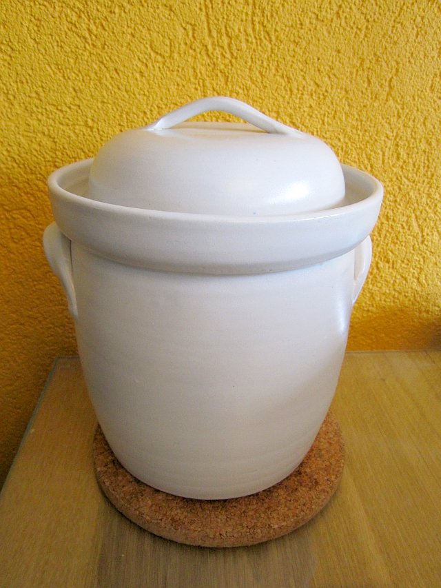 Ikzelf gebruik graag mijn keramieke Keulse potvan 3 liter. Dat geeft ruim voldoende zuurkool voor een mooi voorraad.